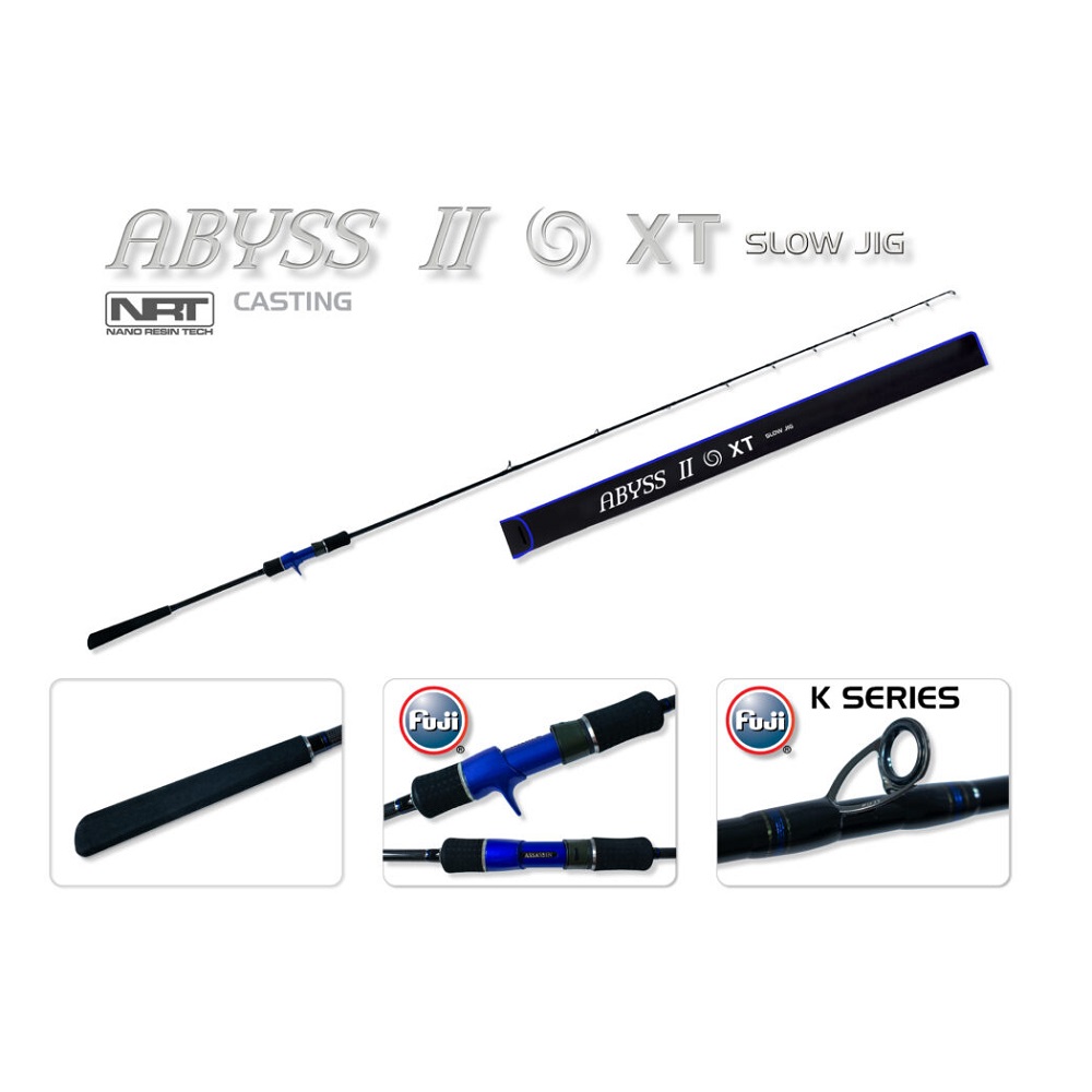 The Assassin Abyss II XT is the Gen 2 slow jigging rod with more models, featuring upgraded longer butt EVA with flat sides and laser dimples for grip. It has a Fuji winch, K-Series Alconite guides, and is the first slow jigging rod with double-foot guides using Fuji L-KW frames, ensuring durability and action. Includes a Neoprene bag.